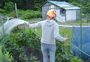畑の水まきも、楽しいものです。ログ製のサンデッキもあり、日焼けもGood!